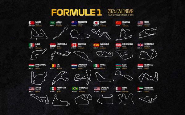 Formel 1-kalenderen for 2024 indeholder 24 løb over hele verden, med en blanding af legendariske baner og moderne gadebaner. Sæsonen åbner i Sakhir, Bahrain (29. feb - 2. mar) og slutter i Yas Marina, Abu Dhabi (6.-8. dec). Kalenderen viser også vinderne af hvert løb, herunder Verstappen, Leclerc, Norris og andre.