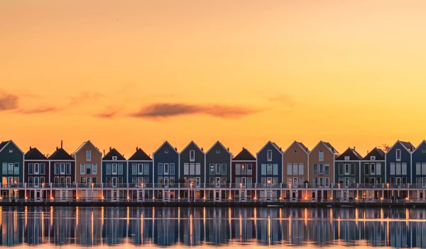 Skrøbelig som fjer på fototapet. En række huse ved havnefronten med en orange himmel i baggrunden.