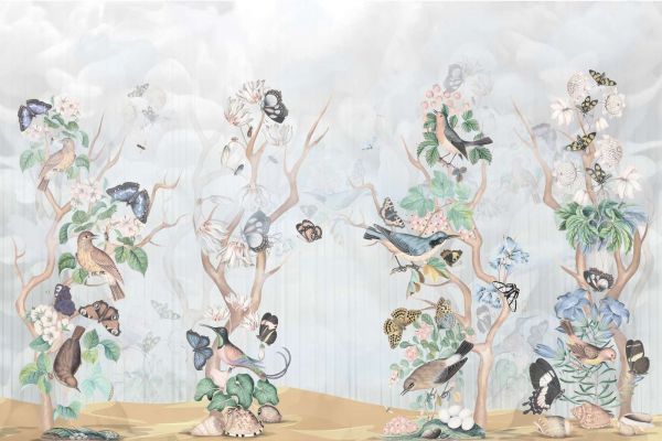 Et drømmende design med delikate fugle, sommerfugle og blomster på skrøbelige grene. De bløde pastelfarver og luftige baggrund giver det en eventyrlig atmosfære, perfekt til en fredfyldt og naturlig ambiance.