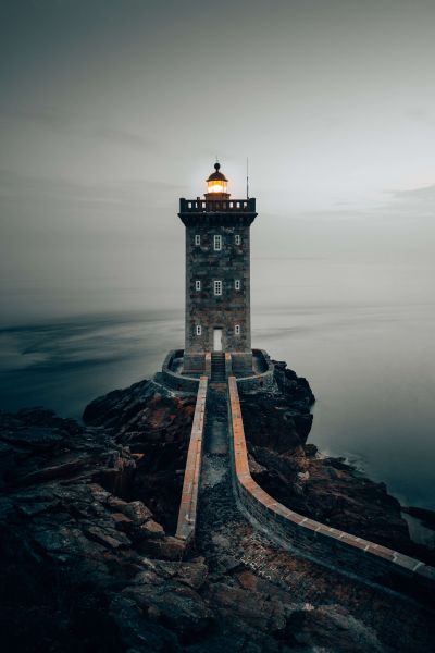 Et smukt fyr i Bretagne. Fyret har sit lys.