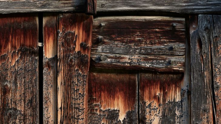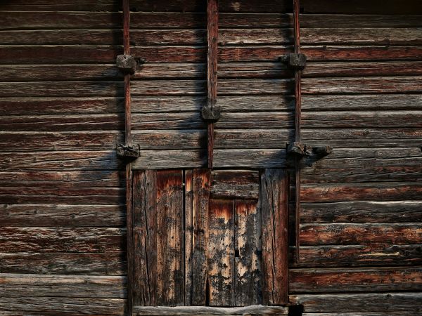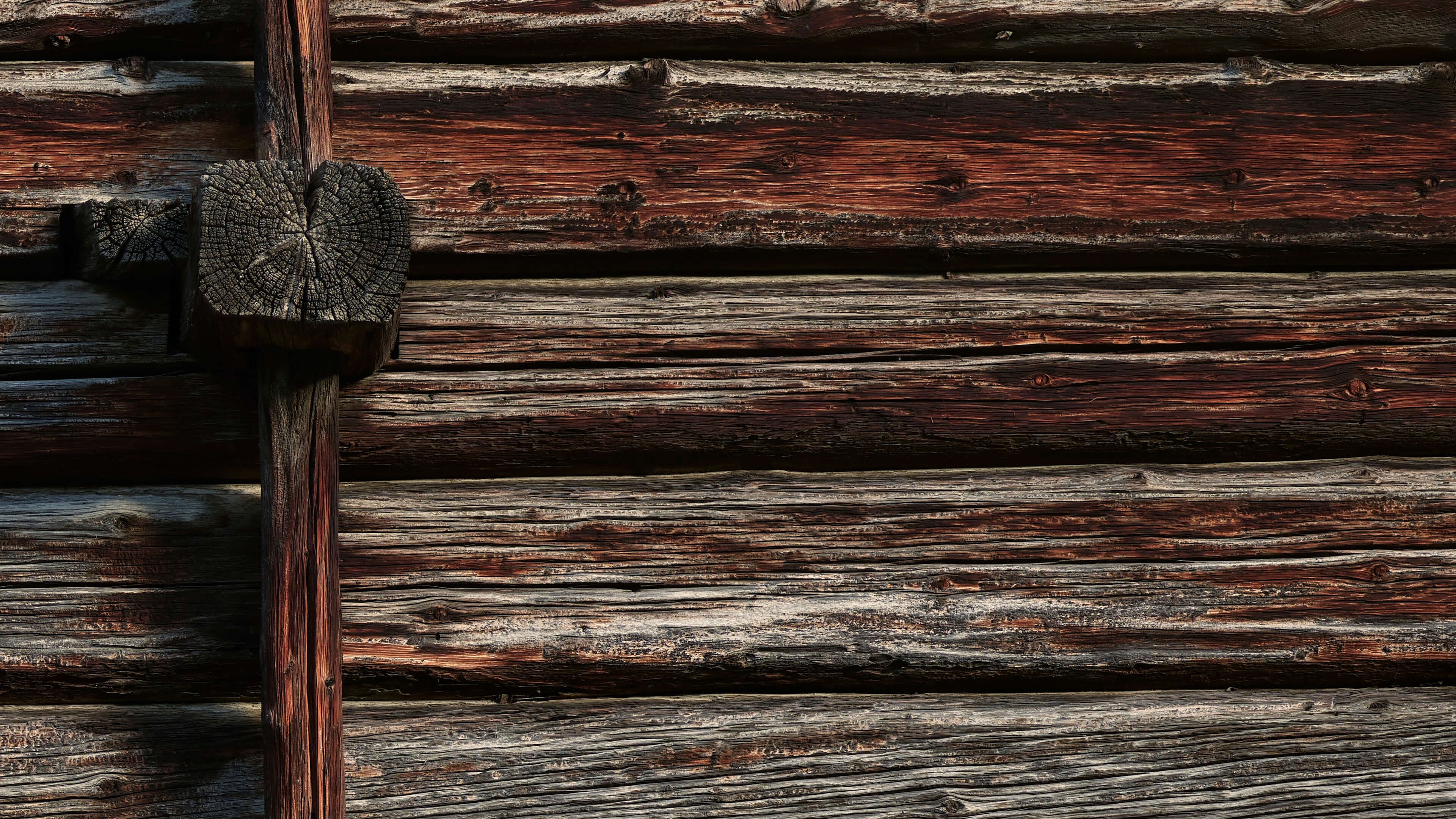 Gammelt træ med bjælker og en dør. Der er en lille del af døren synlig, hvilket får det til at se ud som om, at man kan gå igennem døren, når dette fototapet er i stuen.