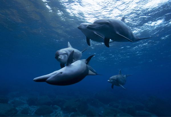 Glad flok delfiner, der svømmer sammen mod kameraet.