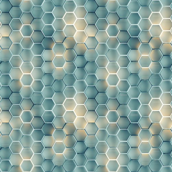 Dette futuristiske mønster af en bikube, oplyst af bløde glødende linjer, leger med lys og skygge for at skabe en fornemmelse af dybde.