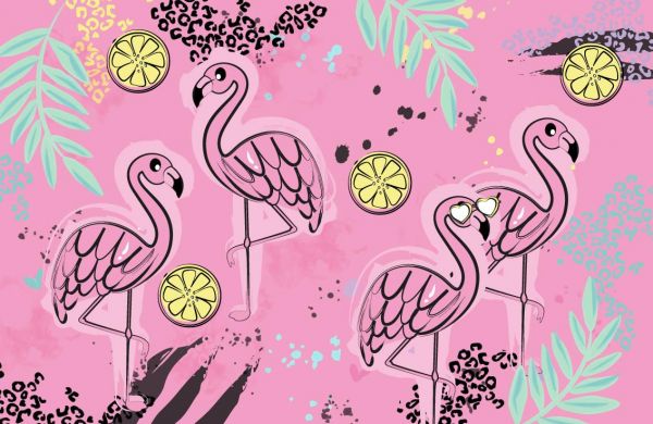 Lyserødt print med seje flamingoer, blade og citroner.