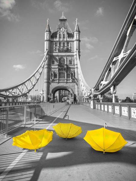 Gule paraplyer på Tower Bridge. Billedet er i sort og hvid med en gul effekt over paraplyerne.