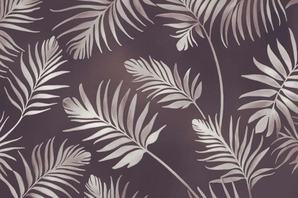 Et raffineret mønster af elegante palmeblade på en dyb, mørk baggrund. De subtile farveskift giver et blødt, næsten malet udseende. Kontrasten mellem de lyse blade og den mørke bund skaber en elegant og tidløs atmosfære, perfekt til en moderne eller eksotisk indretning.