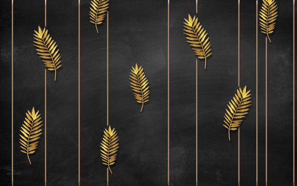 Gyldne tropiske blade på en sort baggrund. Den mørke baggrund får bladene til at skille sig endnu mere ud.