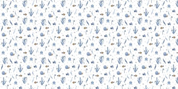 Subtile blåtoner vækker den fredfyldte enkelhed af oceanet til live i dette minimalistiske mønster. De stiliserede fisk- og skalformer er symfonisk arrangeret mod en krystalklar baggrund, der udstråler en følelse af ro og klarhed.