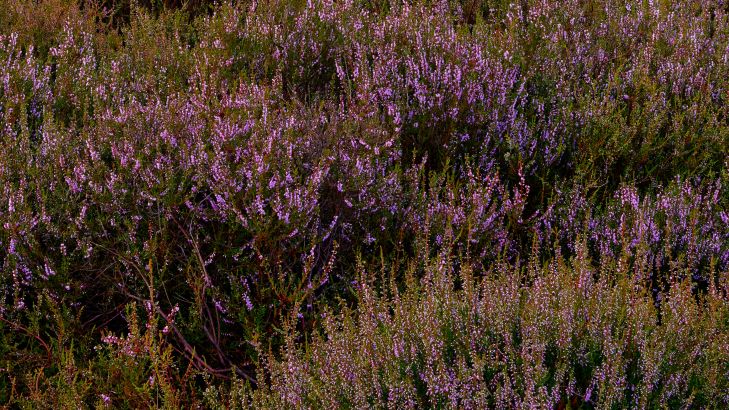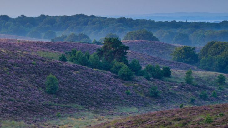 En tidlig morgen i nærheden af heden. I det fjerne hænger tågen stadig over heden. Det bliver en smuk dag.
