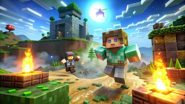 Et fortryllende pixelagtigt landskab oplyst af en stor måne. Karakterer i farverige outfits løber gennem et bakket terræn, omgivet af lejrbål, stenruiner og grøn vegetation. Den dynamiske komposition udstråler eventyr og mystik.