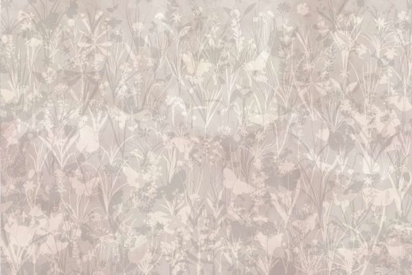 Et delikat design, hvor sommerfugle og urteagtige blomster mødes i et lagdelt spil af bløde pastelnuancer. Den subtile silhuet af flora og fauna skaber en fredfyldt og tidløs atmosfære.