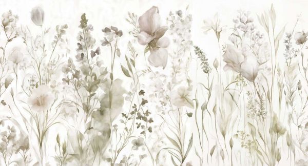 Denne grønne variant udstråler friskhed og forbindelse til naturen. Fokus er på de forskellige nuancer af grøn, fra salvie til mosgrøn, der elegant samles med bløde blomsterdetaljer i hvid og lys gul. Akvarelteknikken gør det hele luftigt og lagdelt, som om du står midt i et åbent felt. Perfekt til et botanisk eller eklektisk interiør, hvor planter og naturlige materialer spiller en hovedrolle. Tænk på en stue med træaccentuer, linnedpuder og stueplanter, hvor dette design bliver et forbindende og forfriskende element. Også i et moderne rum med meget lys og minimalistiske møbler skaber denne grønne blomstereng balance og ro. Den bløde overgang mellem blomst og blad gør det til et alsidigt design, der passer ind i mange forskellige boligstile.