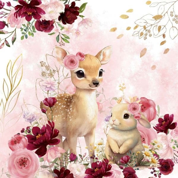 Et sødt rådyr og en kær kanin, omgivet af et hav af romantiske blomster i dybe bordeaux- og bløde rosetoner. De gyldne accenter og subtile akvarelbagside giver det hele et elegant, drømmende udseende, perfekt til en eventyrlig atmosfære.