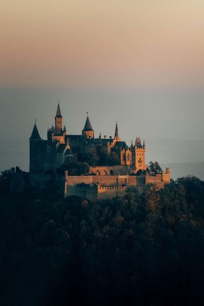 Den lave morgensol skaber et smukt lys på de mange tårne og mure på dette slot. I baggrunden ses en subtil farvegradient med bløde toner.