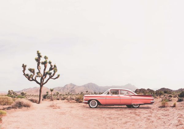 Et billede af en ældre bil i ørkenen. Kombiner dette billede i soveværelset, for eksempel.