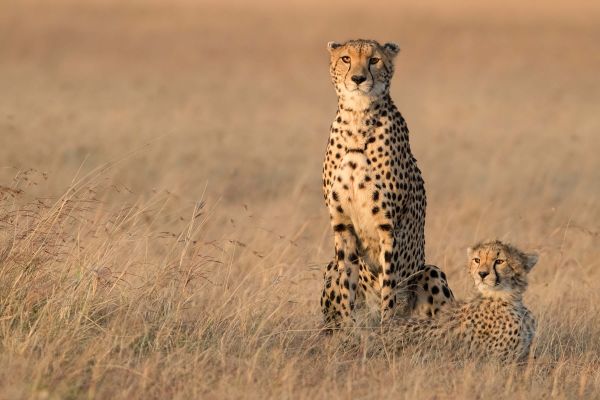 Fotobehang van een jachtluipaard met een welpje in de ochtend zon.