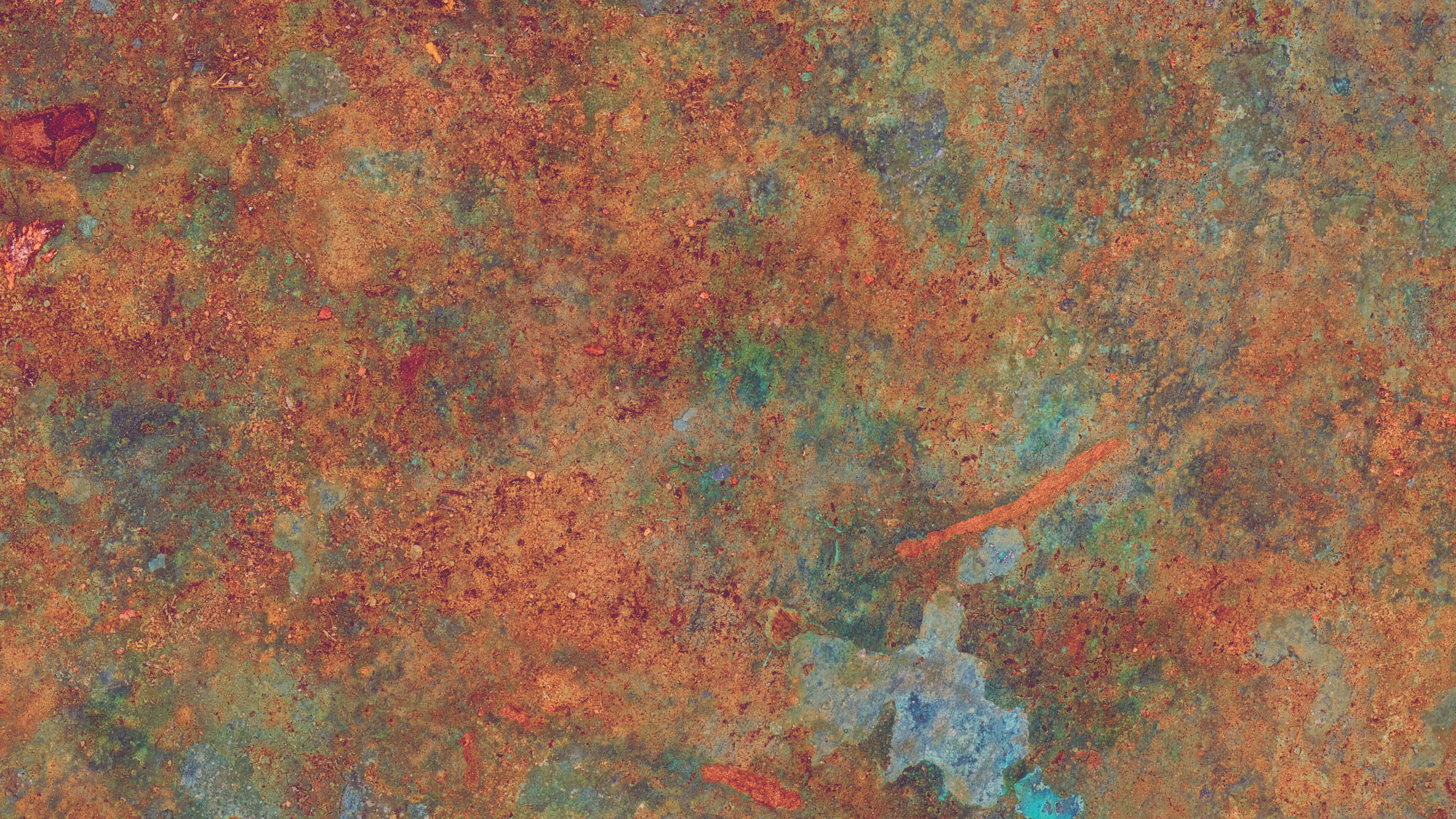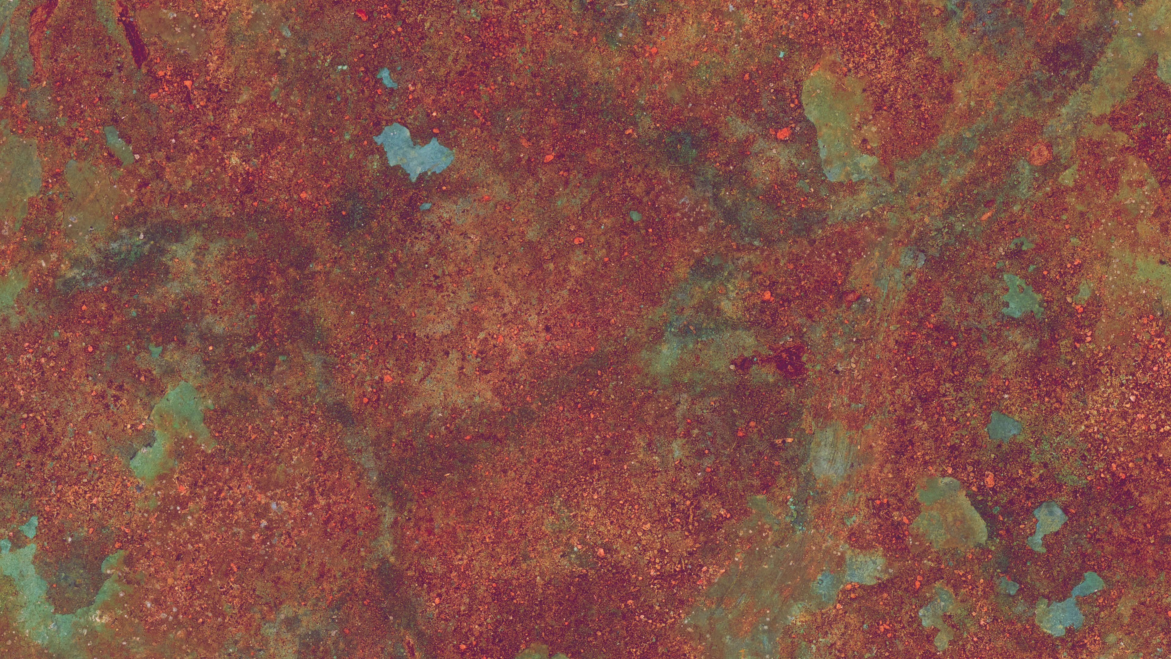 Oxideret metal i farve. På grund af den rødbrune og grønne farve kan du nemt kombinere dette fototapet på dit værelse.