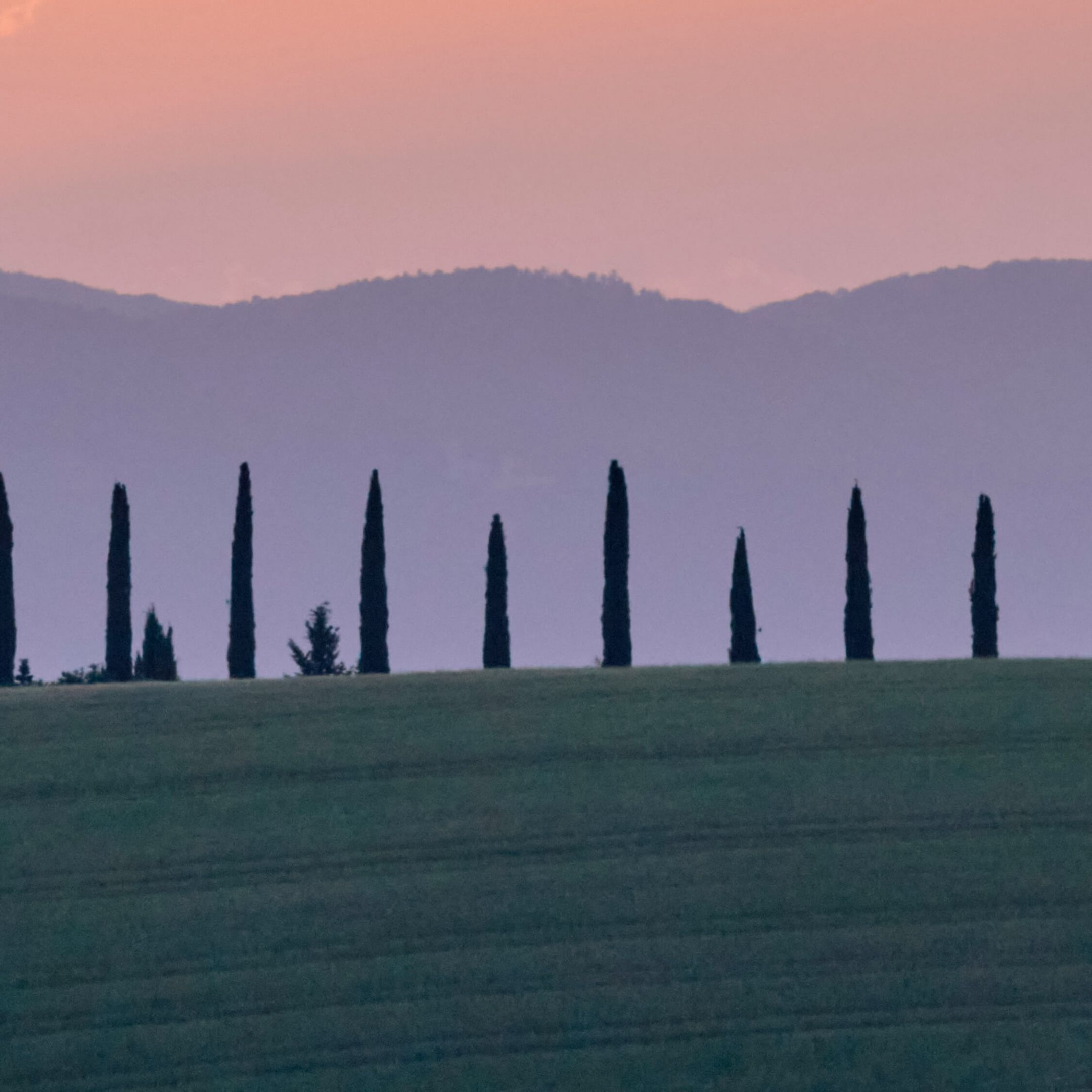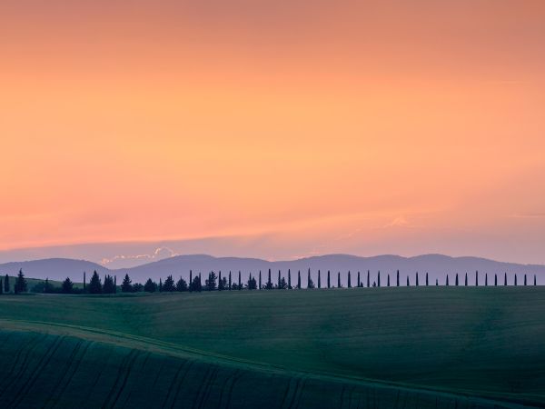 Smuk orange himmel ved en solnedgang over et italiensk landskab