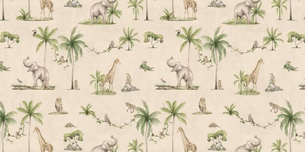 Et muntert jungle mønster med eksotiske dyr som elefanter, giraffer, løver og leoparder, mellem palmer og grønt løv. Den lyse baggrund og detaljerede illustrationer skaber en legesyg og luftig atmosfære, ideel til at tilføje et eventyrligt præg til ethvert rum.