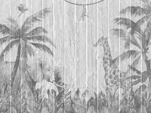 Muntere jungledyr med forskellige planter på træ i forgrunden. Tapetets træ-look gør det velegnet til et hårdt rum.