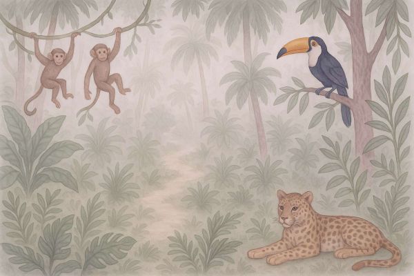 Denne drømmende junglescene bringer et roligt, tropisk landskab til live, indhyllet i en blid morgentåge. To glade aber svinger legende fra en lia, mens en ung leopard ligger stille i det grønne og betragter. På en gren til højre sidder en tukan med en iøjnefaldende orange næb, der tilføjer et strejf af farve til den ellers rolige indstilling. Junglen er rig på frodige blade, palmetræer og en blid snoet sti, der fører dybt ind. Farvepaletten består af blide grønne nuancer, varmbrun, sandfarve og et accent i dybblå og orange til tukanen. Denne kombination skaber en rolig udstråling med et legende præg. Den tågede baggrund og det subtile farveforløb bidrager til en følelse af ro, hvilket gør dette design særligt velegnet til baby- og børneværelser. Dette design passer smukt ind i en botanisk eller bohemeindretning. Kombiner det med møbler af rattan eller bambus, tilbehør af naturlige materialer som jute eller bomuld, og bløde puder i nuancer som salviegrøn, beige eller rust. Fluffy dyreknusere og træjunglefigurer gør det hele legende og indbydende. Perfekt til brug bag en vugge eller seng, eller som rolig baggrund for et læsehjørne. Designet indbyder til fantasifulde historier og opdagelser, uden at overvælde. Kompositionen er luftig og rummelig, hvilket også gør det velegnet til mindre rum.