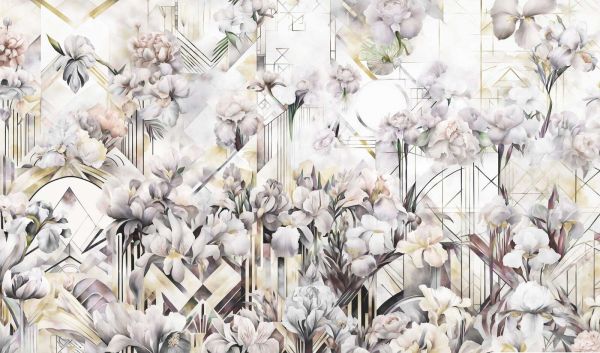 Et elegant design, hvor yndefulde iris og pæoner smelter sammen med raffineret Art Deco-geometri. Kombinationen af bløde guld- og cremetoner med subtile gråtoner giver det et luksuriøst og tidløst udseende. Den delikate akvarelteknik skaber en luftig og raffineret atmosfære.