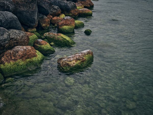 Klipper ved en klar bjergsø. Vandet er så klart, at man kan se bunden.