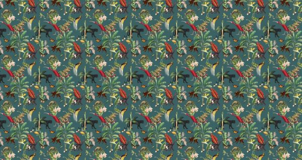 Dit design dykker dig ned i en eksotisk jungle fyldt med livlige detaljer. Papegøjer, aber og sommerfugle bevæger sig mellem frodige tropiske planter og blomster, mens den rige grønne baggrundsfarve forstærker den naturlige energi fra regnskoven. Klare røde, gule og orange accenter giver det hele et dynamisk og legende udtryk, der minder om eventyr dybt inde i troperne.