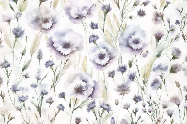 Et elegant mønster af valmuer og kornblomster i bløde akvareltone af lavendel, lilla og grågrøn. De raffinerede penselstræk og subtile farveovergange skaber et drømmende, beroligende udtryk, perfekt til en romantisk og fredfyldt atmosfære.