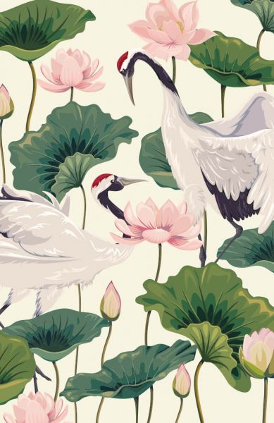 Een kraanvogelpaar tussen de lotus bloemen. Combineer dit fotobehang in jouw slaapkamer of woonkamer.