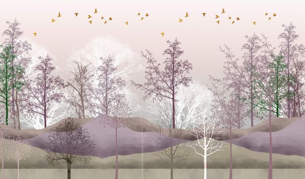Landskab med farverige træer og fugle. Gør din væg til et ægte blikfang med dette tapet.