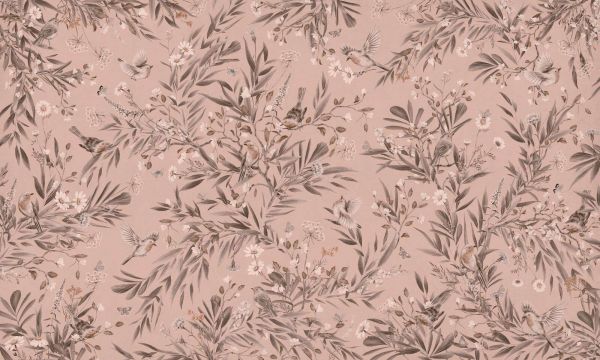 Bløde fugle flakser mellem blomster og grene på en varm gammelrosa baggrund. De bløde jordfarver giver dette mønster et drømmende, klassisk og romantisk udseende med naturlig elegance.