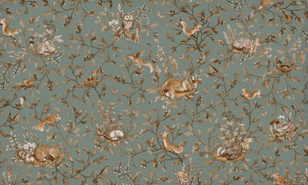 Dit design bringer en eventyrlig skovlandskab til live, hvor ro og natur forenes på en blid salviegrøn baggrund. Slanke egetræsgrene fyldt med blade, agern og blomster slynger sig legende gennem billedet. Mellem bladene ser du kaniner hyggeligt sove i deres reder, egern leger gennem grenene, en ugle holder vagt, og små fugle sidder beskyttet i deres reder. Overalt mellem bladene opdager du sommerfugle, svampe, snegle og blomstrende planter - som om du går gennem en stille skov. Kombinationen af den rolige salviegrønne farve med varme brune og okerfarver skaber en harmonisk og tryg atmosfære. Dette gør designet perfekt til et naturligt børneværelse eller en blød og tryg babyindretning, men også smukt som accent i en landlig gang eller en hyggelig læsekrog. Farverne føles jordnære og friske på samme tid, hvilket gør dem velegnede til at kombinere med andre naturlige materialer som træ, linned og uld. Illustrationerne er forfine og rige på detaljer, med et håndtegnet udseende, der minder om klassiske billedbøger. Gentagelsen af grenene skaber rytme, mens dyrene og blomsterne tilføjer en legende, livlig karakter. Mønsteret forbliver luftigt og blødt, på trods af den rige fyldning med dyr og planter. Stylingtip: kombiner dette design med møbler i lyst træ eller rattan, bløde puder i sand- eller sennepstint og dekorationer af filt eller uld. Også smukt med tilbehør i fløde, kobber eller terrakotta. Dette skaber et varmt, naturligt rum, hvor både børn og voksne kan slappe af.