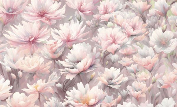Et romantisk og raffineret blomsterdekoration med bløde pastelfarvede blomster i nuancer af puderosa, crème og lys lilla. De subtile penselstræk og den drømmende baggrund skaber et lyst, roligt og elegant udtryk, perfekt til et afslappende interiør.