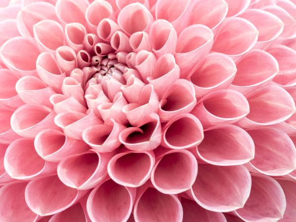 Lyserød dahlia i nærbillede. Ved at tage et nærbillede er blomstens blade tydeligt synlige.