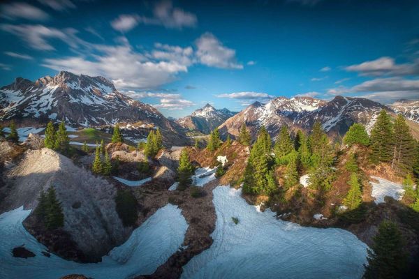 Et farverigt bjerglandskab i overgangen fra vinter til forår, med klart grønne fyrretræer, smeltende snefelter og imponerende tinder under en strålende blå himmel fyldt med skyer.