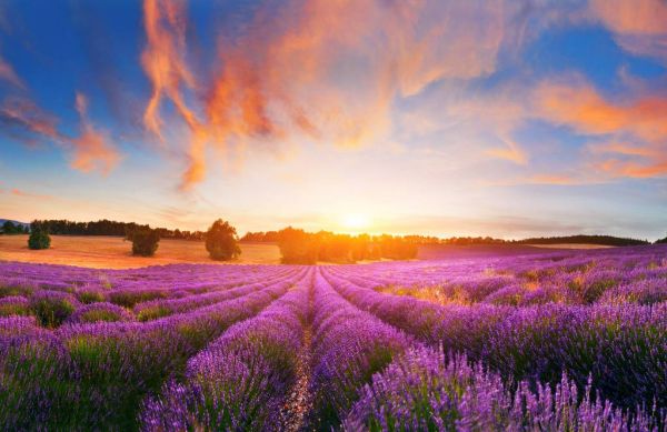 En mark med lavendelblomster i fuldt flor. I baggrunden ses en nedgående sol, der giver et malerisk billede.