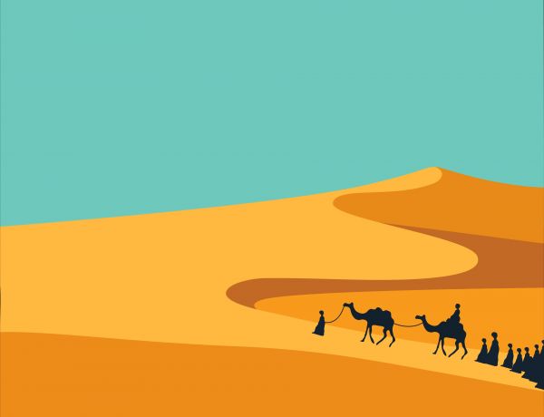 En silhuet af mennesker i ørkenen. Kombiner dette fototapet i f.eks. børneværelset.
