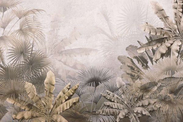 Dit raffinerede botaniske design fremhæver den stille skønhed af et tropisk landskab med en blød, tåget udstråling. De lagdelte palmer og bananblade i varme jordfarver skaber en subtil, naturlig kontrast mod den lyse, teksturerede baggrund. Kombinationen af udtonede silhuetter og detaljerede blade skaber dybde og en beroligende visuel effekt, perfekt til et tidløst og stilfuldt interiør.