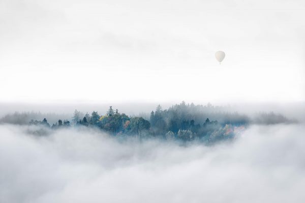 En skov dækket af tåge. En varmluftballon er synlig på himlen.