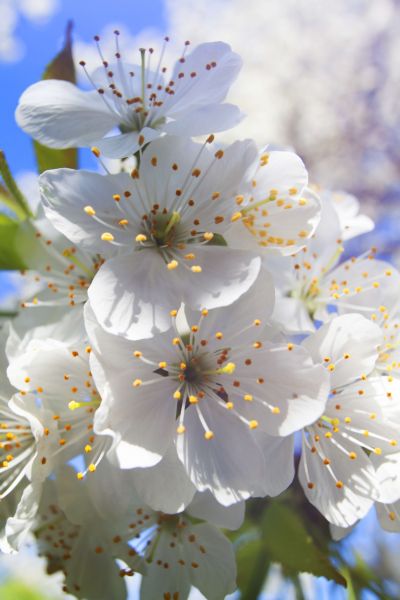 Et nærbillede af hvide japanske blomster med grønne blade.