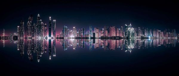 Et futuristisk bylandskab badet i neonlys, spejlet i glasklart vand. Dybblå natlige toner kontrasterer med levende lyserød, lilla og hvid, hvilket skaber en drømmende, næsten surrealistisk stemning fuld af ro og energi.