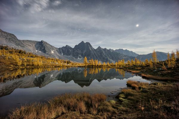 Et billede af bjergtoppe med en sø omgivet af træer. Stjernerne er også allerede synlige.