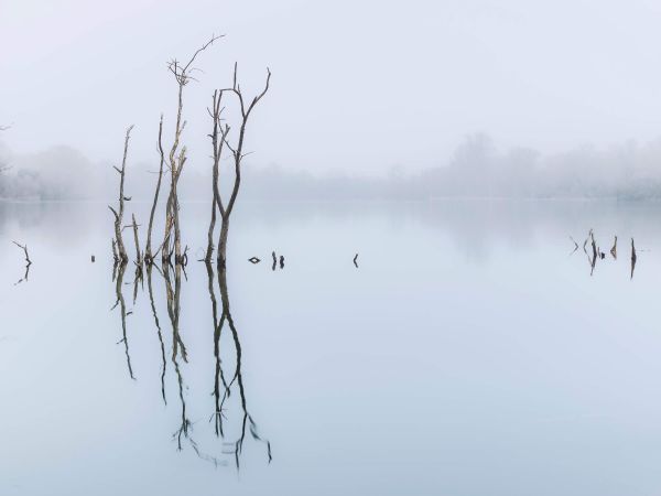 En øde sø i tågen. Søen ser forladt ud på grund af tågen.
