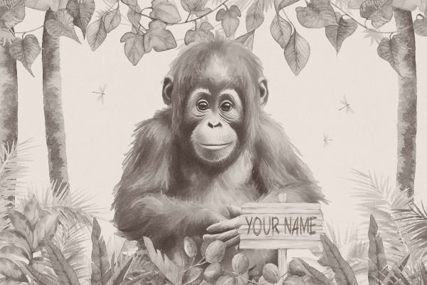 En ung chimpanse, omgivet af det frodige løv i sit hjem i skoven, kigger ud med et blik fuld af forundring. De bløde akvareltoner giver dette charmerende design en fredelig og legende atmosfære.
