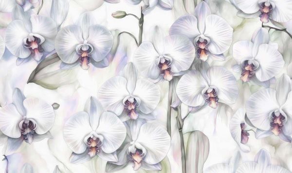 Sirlige hvide orkideer med bløde akvarelaccenter i pastelfarver skaber et drømmende og elegant udtryk. De delikate blomster, indrammet af subtile grønne blade, udstråler ro og raffinement. Den let slørede baggrund forstærker det eteriske effekt, hvilket skaber en fredfyldt og tidløs atmosfære.