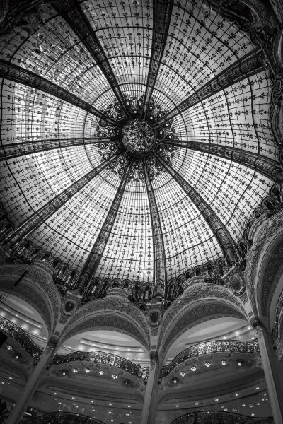 En imponerende glaskuppel fyldt med smukke ornamentik og symmetriske linjer. Kontrasten mellem sort og hvid understreger bygningens storslåethed og arkitektoniske finesse.