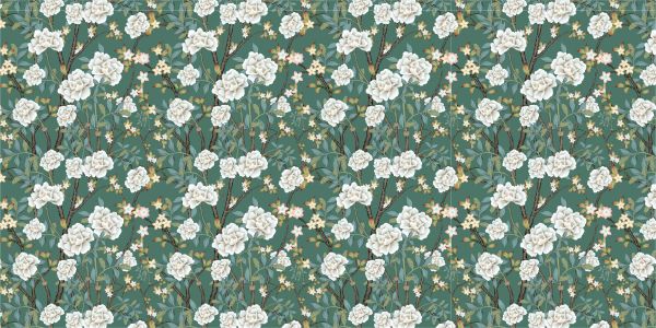 Et rigt tapet af haveroser blomstrer på en rolig grøn baggrund med nuancer, der spænder fra dyb jade til bløde pastelgrønne nuancer. De mørke grene giver en stærk kontrast og fremhæver de rene, hvide kronblade yderligere.