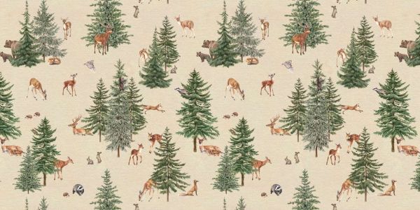 Et stemningsfuldt skovmønster med hjorte, ræve, bjørne og andre skovdyr, omgivet af majestætiske fyrretræer. Den bløde baggrundsfarve og de detaljerede illustrationer bringer roen fra en fyrreskov til live, ideelt til at skabe et naturligt og varmt udtryk i ethvert rum.