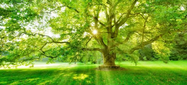 Solen skinner gennem de grønne blade af dette gigantiske platantræ